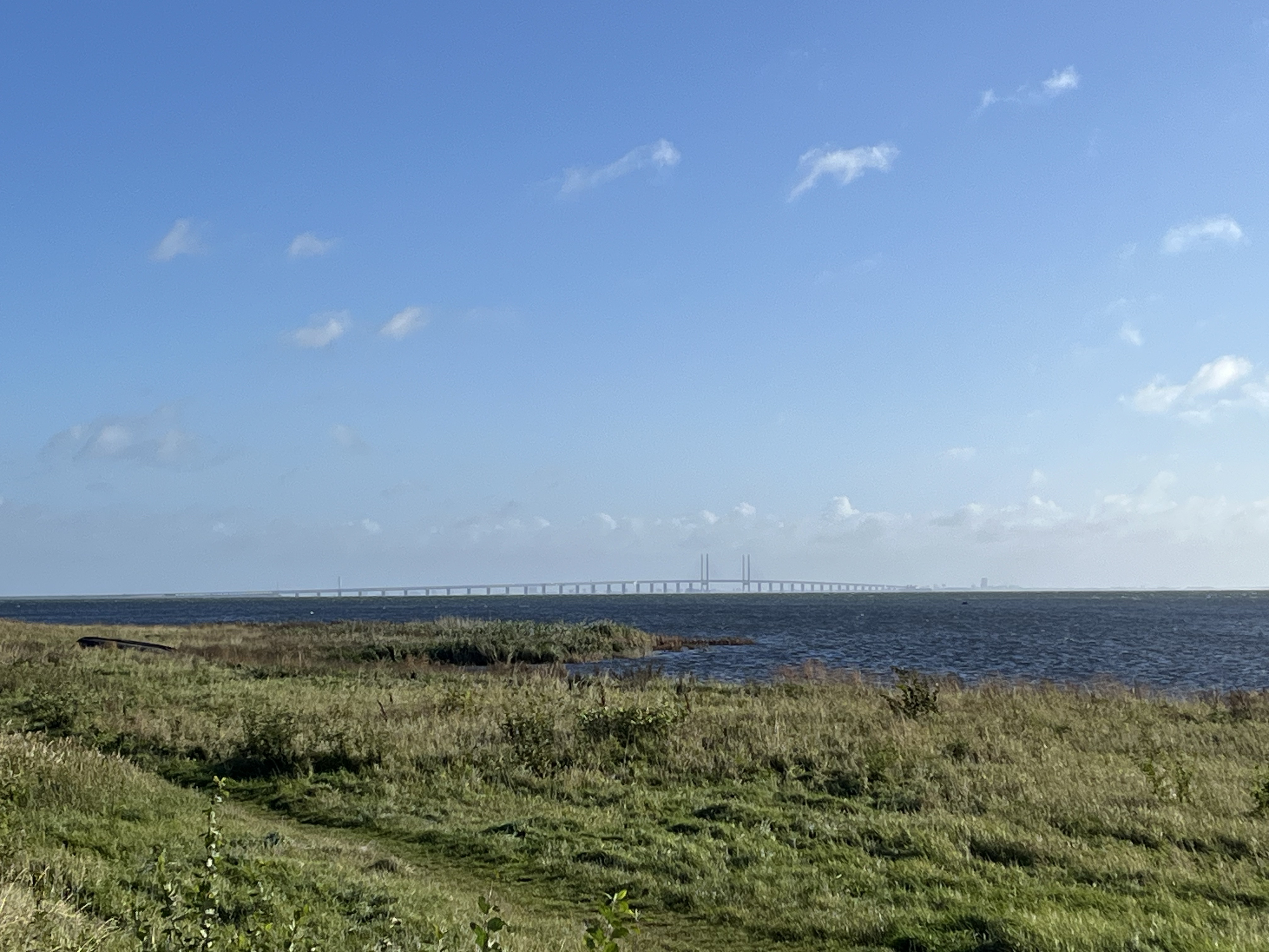 Men inden vi kom så langt, startede vi med et par hundrede meter på Kalvebodvej, inden vi kunne dreje ind i skoven igen og nyde mere af den solbeskinnede Kongelund, imens vi kantede os imod Amagers sydkyst, og efter noget tid blev belønnet med den storslåede udsigt imod Dragør med Øresundsbron og Peberholmen i baggrunden.