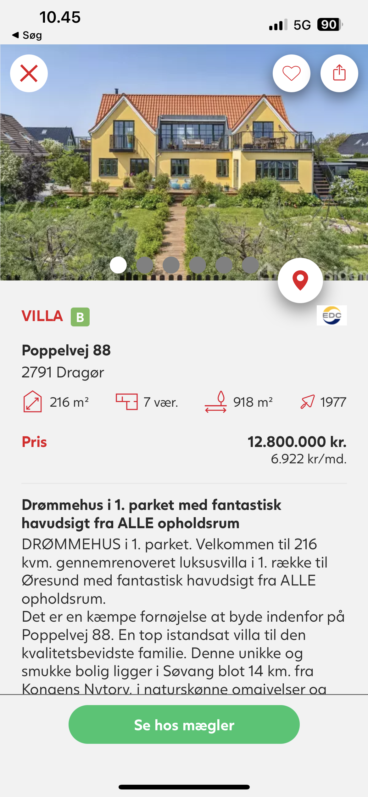 Nord for Dragør i første parket til vandet, kunne man købe dette fine gule hus, der blot stod i 12,8 millioner. Det var 5 millioner dyrere end syd for Dragør, hvor der var et tilsvarende hus til blot 7,3 millioner. Jeg tror jeg bliver i Køge.