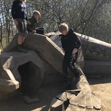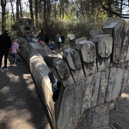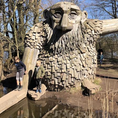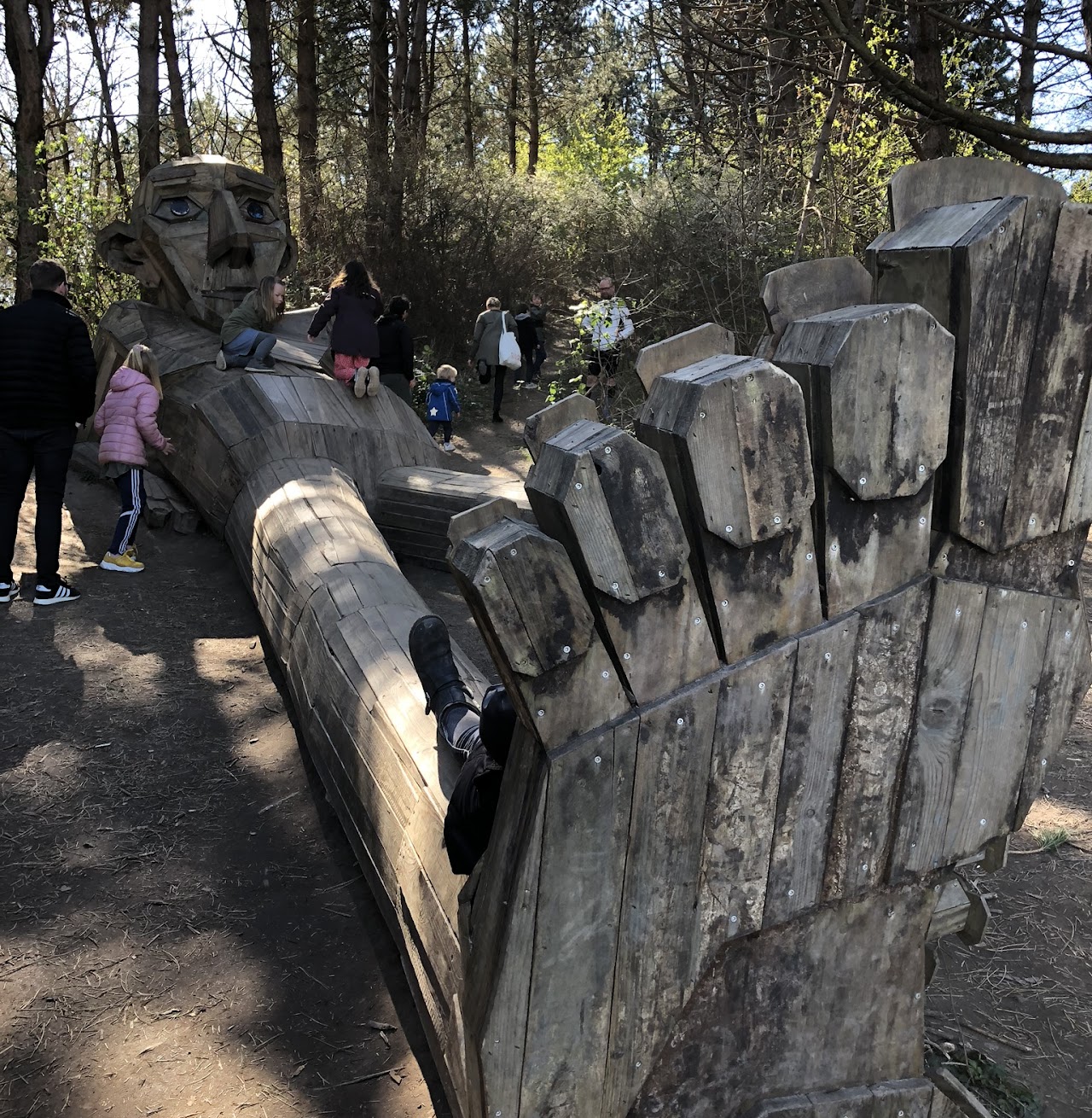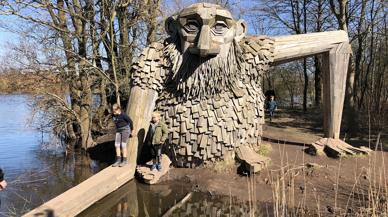 Jeg var slet ikke bekendt med dette grønne område, der ligger ude bag Taastrup, og hvor man også kan finde Teknologisk Institut, men det er jo det herlige ved denne slags ture. Der var motionsspor af varierende længde, men heldigvis skulle man ikke så langt, for at finde Venlige Teddy, der var vores tredje kæmpe og nummer seks på kortet. Med hans lange arme og korte statur kunne han hjælpe børnene over vandet.