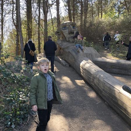 Den første, eller rettere sagt femte kæmpe var Thomas på Bjerget, der ligger og slænger sig på en af de høje bakker i Vallensbæk Mose. Det var nok her vi stødte på flest mennesker, i hvert fald samlet omkring kæmpen. Det var også her vi fik gået længst, da begge kæmper i mosen, lå en god gåtur fra offentlig vej.