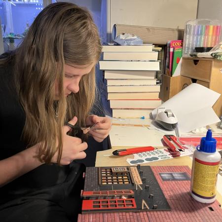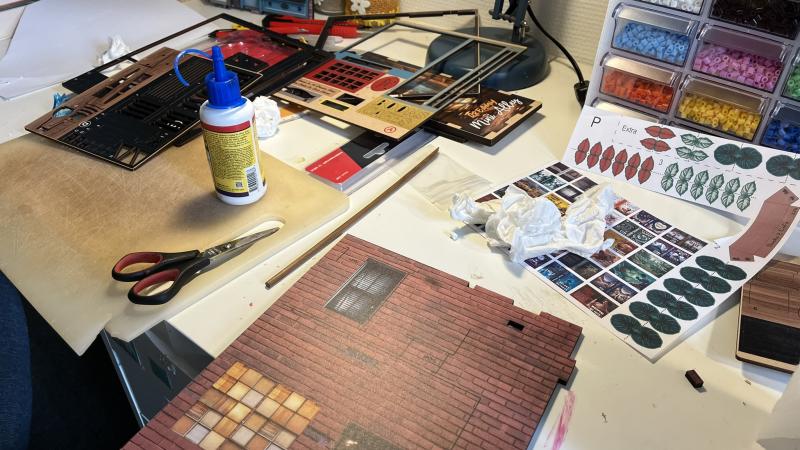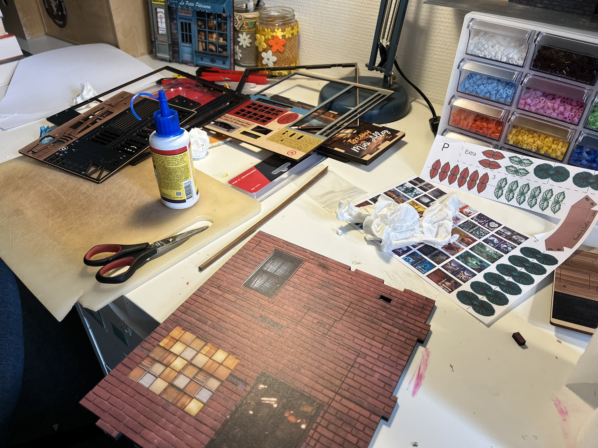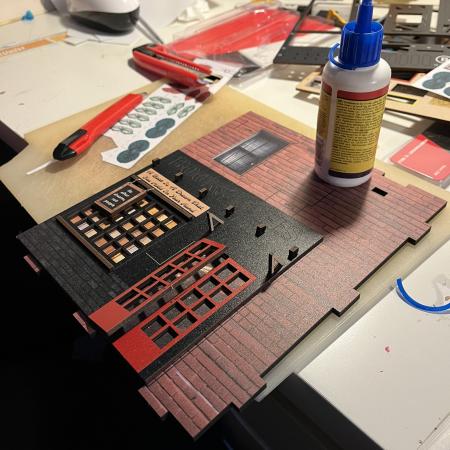 Det var Sylvester og jeg som startede med projektet, hvor etape et var at lime detaljer på en husmur, herunder vinduer, døre og skilte. Vi skulle også udklippe en lille markise, og montere den over en butik, nærmest som i virkeligheden.
