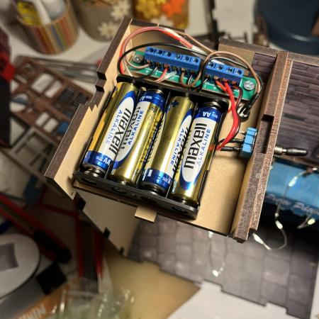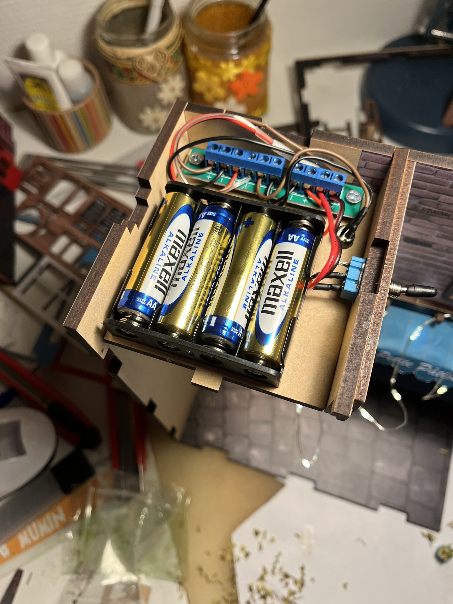 I tredje etape skulle vi have vores lille elektriker frem, for nu skulle der trækkes ledninger og installeres små led-pærer, som alle skulle samles i et lille printkort og tilsluttes en batterikasse. Vi klarede det - og endda i første forsøg, så nu var der også lys over land.