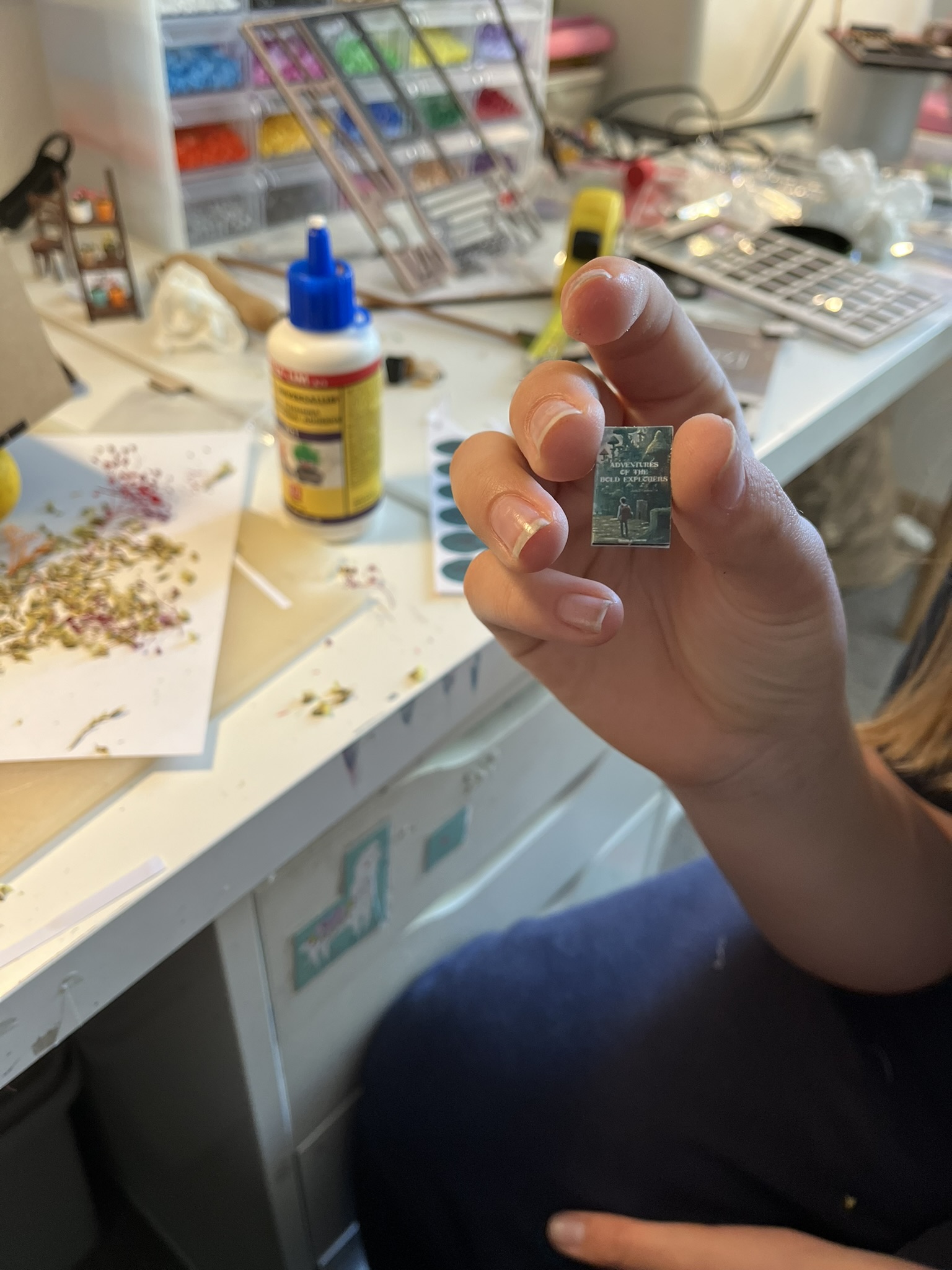 Den sidste etape var 30 minibøger, som minutiøst skulle have udklippet coverne, og gøres klar til at komme ind i en lille bogreol, hvilket bestemt også tog noget tid. Og så var der kun tilbage, at montere alle detaljerne og med et var vi færdige.