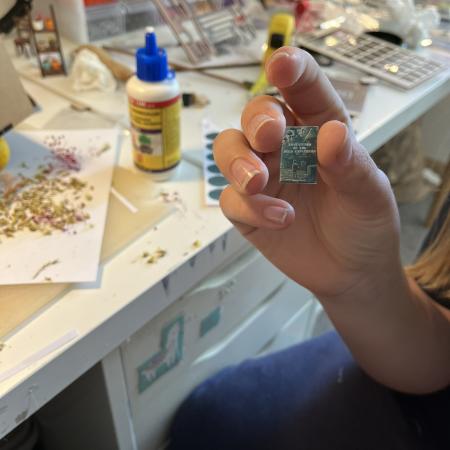 Femte etape var et kapløb imod uret, for her skulle man blande lim med kunstgræs, og udsmykke en række mikroskopiske potter med endnu mere mikroskopiske blomster, alt imens limen langsomt men sikkert blev mere og mere tør, og umedgørlig. Vi holdt dog hovedet koldt og det lykkedes os, at producere 16 små unikke potteplanter. Resten af kunstgræsset blev smurt på balkonen som mos.