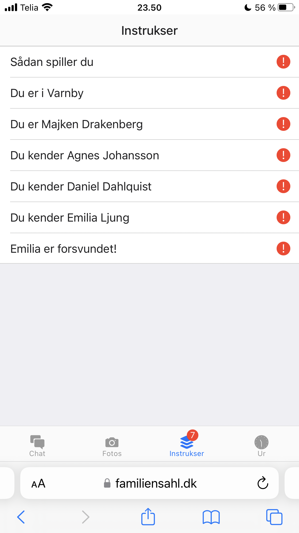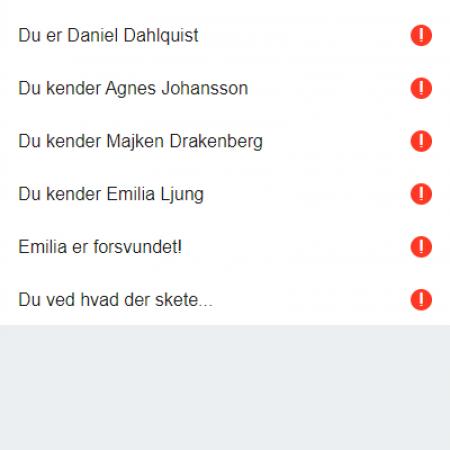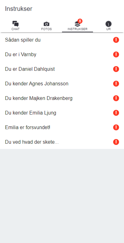 Min virtuelle app fik fire funktioner: En chat hvor man interagerer med de andre spillere. Et fotobibliotek hvor man kan vise billeder i forbindelse med historien der udspiller sig. En instruktionsside hvor spilleren bliver sat ind i historien, og undervejs i spillet modtager yderligere instruktioner. Og til sidst et ur, så man kan holde styr på spiltiden og endda pause spillet.