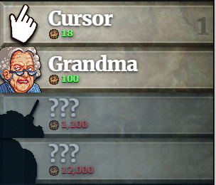 Nu er spillet dog så snedigt, at hver gang man køber noget, så går prisen på det en anelse op. F.eks. stiger prisen på en bedstemor til 115 cookies efter man har købt den første, og dermed stiger prisen per klik ligeledes til 115 cookies. Det er dog stadig billigere end cursoren, hvor hvert klik kostede 150 cookies, så vi kan blive ved med at købe bedstemoren indtil prisen overstiger 150 cookies, hvorefter det så er favorabelt at købe cursoren.