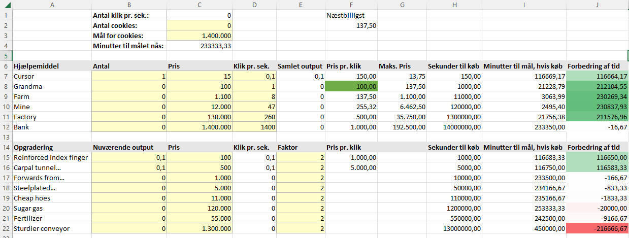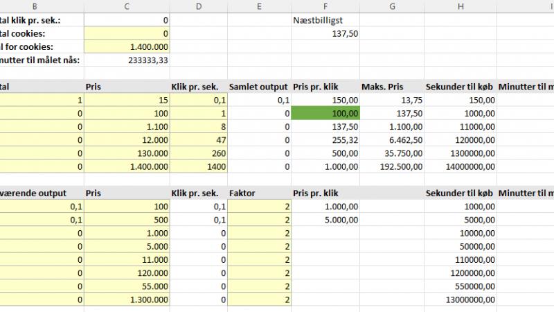 Øverst i arket kan du notere hvor mange cookies du har, og hvad dit næste mål er i antal cookies (typisk værdien på det næste hjælpemiddel du endnu ikke har set)
