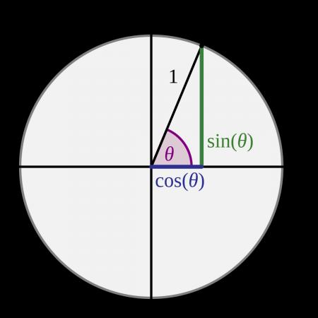 Først kan jeg bevæge rumskibet, hvilket er ret simpelt. Jeg starter med at undersøge den nuværende rotationshastighed, og herefter roterer jeg min sprite med denne. Herefter undersøger jeg rumskibets hastighed, og så flytter jeg det tilsvarende fremad. Det sidste er lidt tricky, for min sprite har jo en x-position og en y-position, og jeg ville jo gerne have at rumskibet bevægede sig fremad, i forhold til den retning det pegede. Her skal vi jo heldigvis blot have fat i skolematematikken endnu engang, for hvis vi ved hvor mange radianer rumskibet er roteret (og det ved spriten jo), så kan vi blot anvende hhv. sinus og cosinus til at beregne hvor meget af hastigheden, vi henholdsvis skal fordele ud på x-aksen og y-aksen.