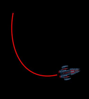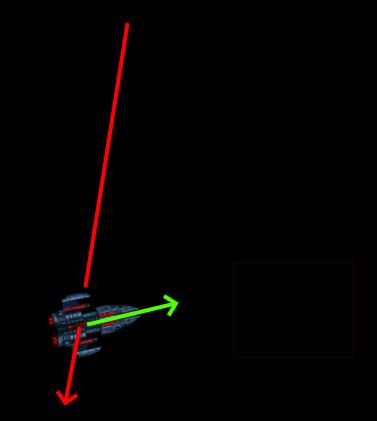 Det virkede - og så alligevel ikke, fordi mit rumskib opfører sig ikke helt, som jeg havde ønsket. Jeg havde ønsket en zero-G effekt, dvs. hvis jeg satte mit rumskib i bevægelse og herefter roterede det, så ville jeg gerne have, at det fortsatte i samme retning, indtil jeg begyndte at accelerere igen som illustreret her: