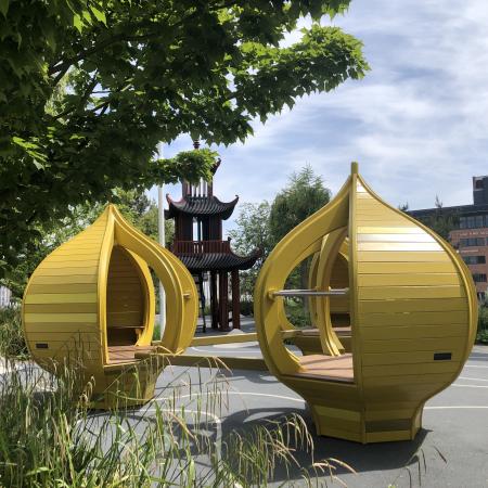 Næste stop på turen over tagene, er Hotel Tivolis taghave, hvor der også er blevet plads til en lille legeplads i Tivoli-kinesisk stil.