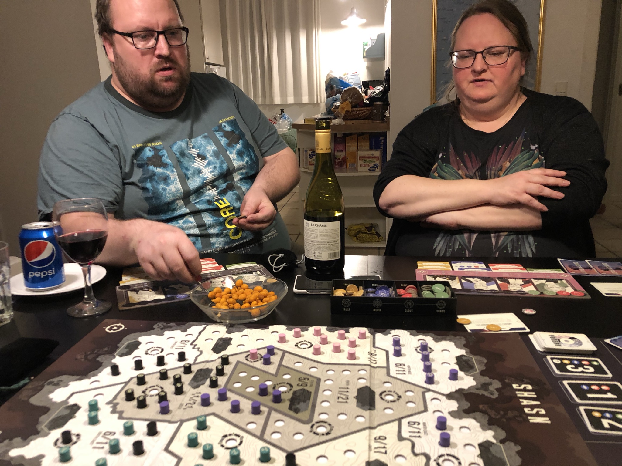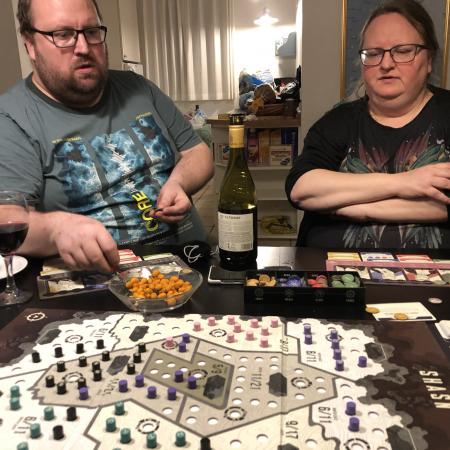 Netop som vi skulle til at drage afsted, kom DHL med en kickstarter-pakke til Michael, som var det politiske spil Shasn, der handler om at erobre flest stemmer i et winner-takes-it-all land. Man skulle udlægge politiske holdninger, men var det nu hvad man stod for, eller hvad som lige blæste ind i ens politiske sejl den dag? Det blev Nicolaj som vandt valget.