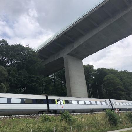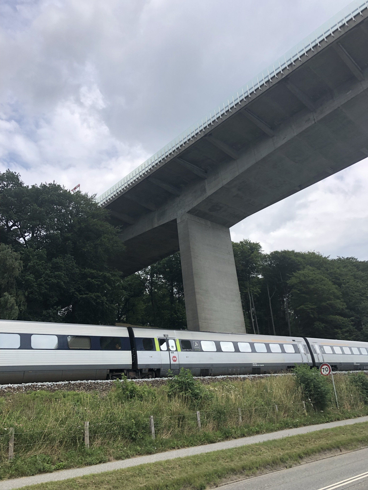 Broen over Vejle Fjord er faktisk en ret imponerende konstruktion, når man kommer tæt på. Men hvis man ikke ønsker at køre bil, er toget jo også en fin mulighed for at komme til Vejle. Det væltede i hvert fald frem og tilbage med tog, der tog den fine tur på begge sider af fjorden.