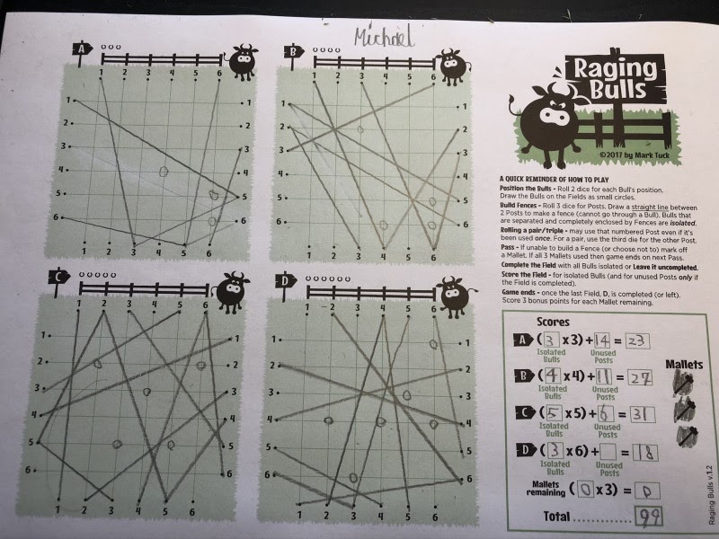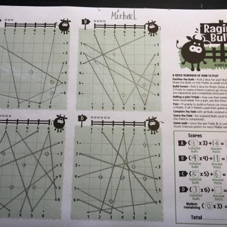 Raging Bulls er et lille spil på et enkelt A4-ark, som går ud på at hegne nogle vilde tyre inde. Først slår man to terninger, der afgør hvor tyrene er på marken, og herefter går det ud på at hegne dem ind. Der står seks hegnspæle på hver side af marken, og de er hver nummereret fra 1 til 6. Hver tur slår man tre terninger, og vælger to af disse numre. Man må herefter tegne en lige linje imellem to hegnspæle med disse numre, og skal på denne måde forsøge at indhegne tyrene hver for sig. Hver hegnspæl må kun anvendes en gang (med mindre man slår dobbelt), så mulighederne indskrænker sig hurtigt. Kan man ikke placere et hegn tre gange, så er spillet slut.