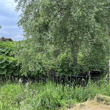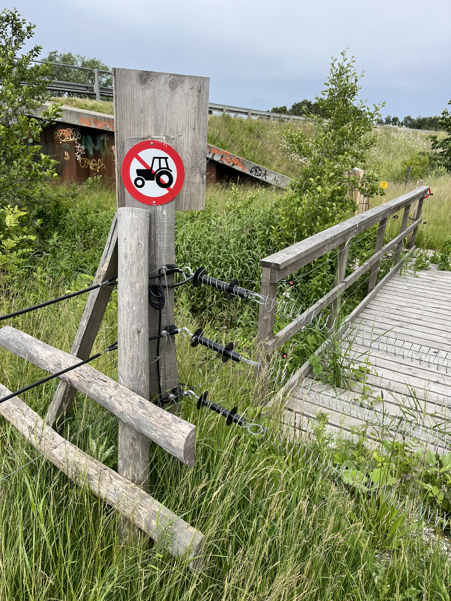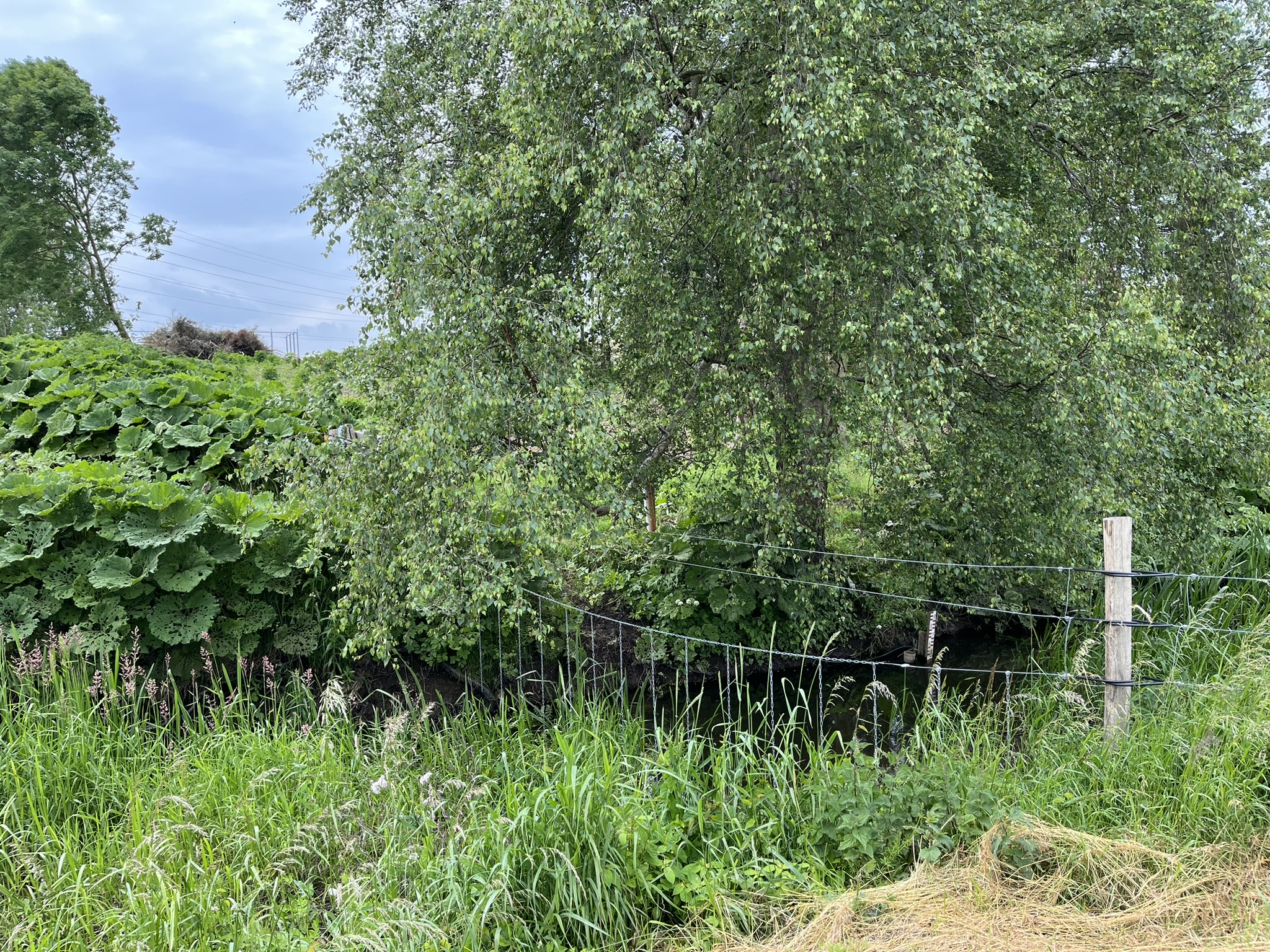 Vi kom en god kilometer, da vejen frem pludseligt var blokeret af et hegn, der gik hele vejen henover åen. Der var dog en låge i hegnet, men uheldigvis sad den syd for åen, som åbenbart var den side man var ment at traversere. Vi måtte derfor følge vores egne fodspor tilbage, men fandt heldigvis et vadested, så vi ikke behøvede at gå hele vejen tilbage til broen. Det kunne dog ikke traverseres uden våde fødder og våde poter.