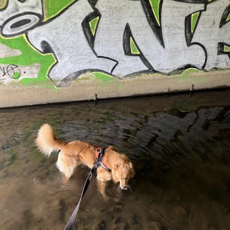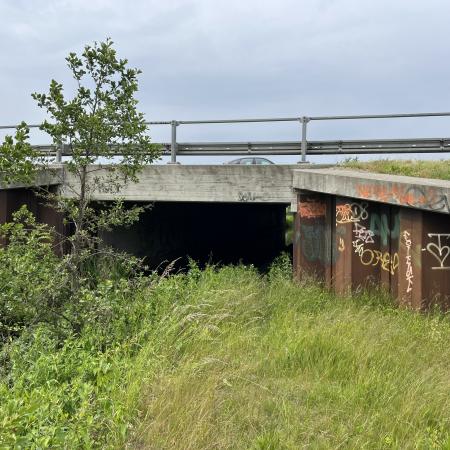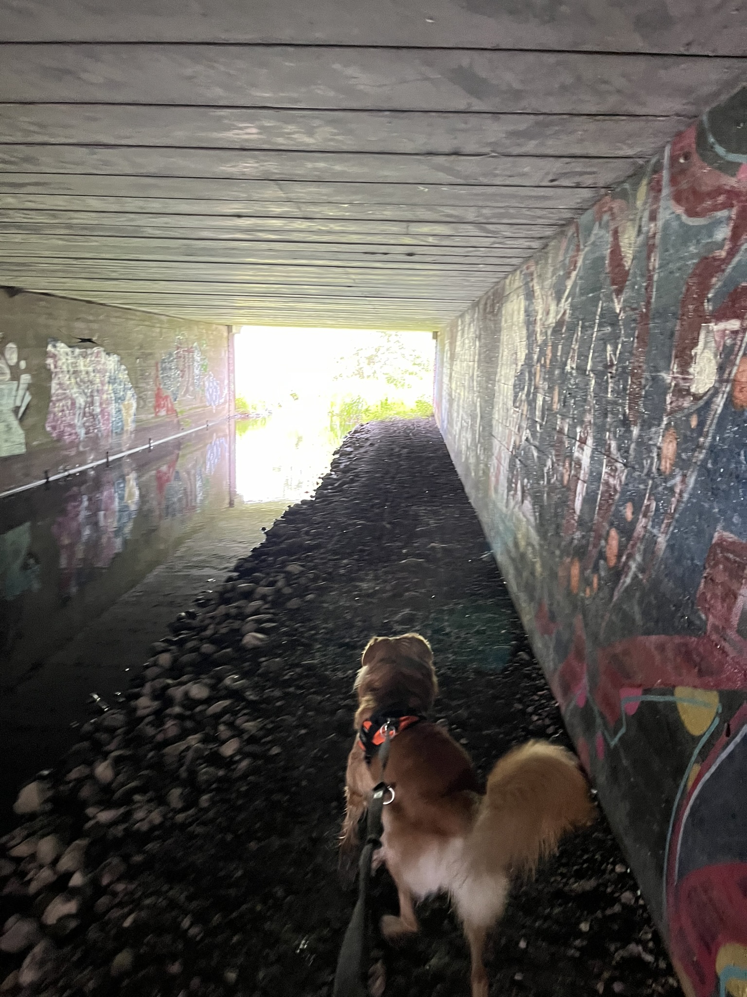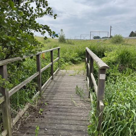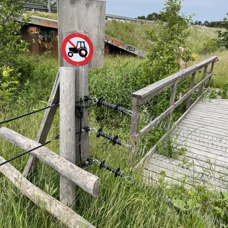 I det nordvestlige hjørne af området, fandt vi en afspærret bro, men vi fandt en vej, at omgå forhindringerne, og pludselig lå den foran os. Porten til den anden side og å-stien.