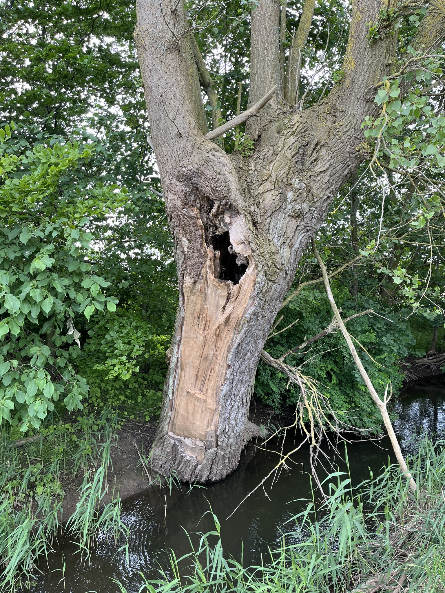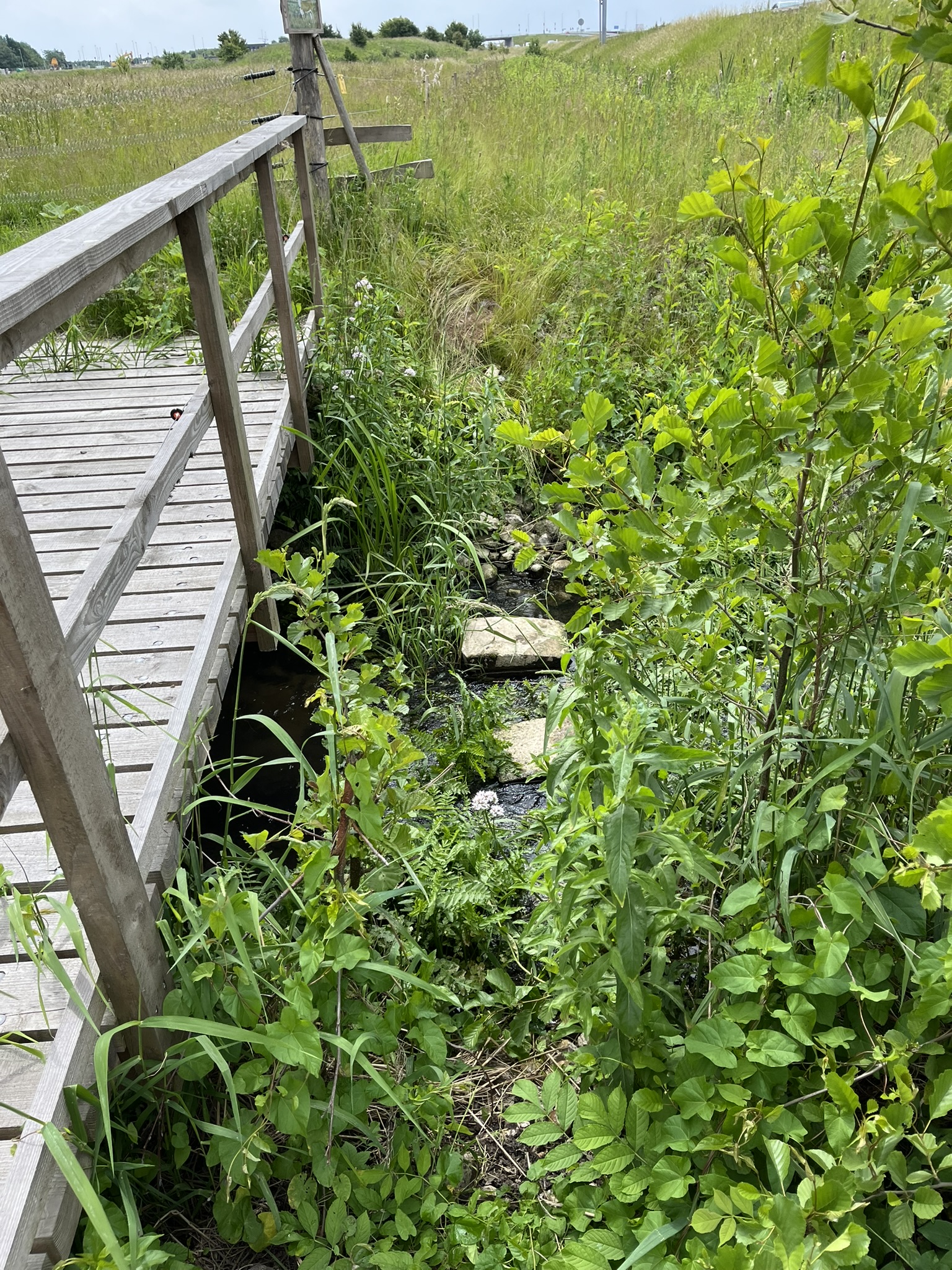 Vi passerede igennem, og fandt endnu en bro - denne var uden afspærring, men det var tydeligt, at intet menneske havde passeret her i lange tider. Vi sneg os under Ringstedbanen og foran os lå det åbne land, og vejen til Lille Skensved. Eller åbent land var måske lidt meget sagt, for sydsiden af åen var så overgroet, at det ikke kunne passe, at man skulle finde passage her. Heldigvis var der lagt en plade over åen, så vi kunne passere henover den - nu for tredje gang og fortsætte vores tur på nordsiden, der var væsentligt bedre ryddet.