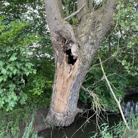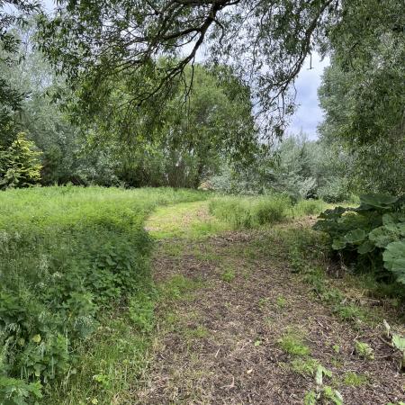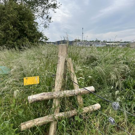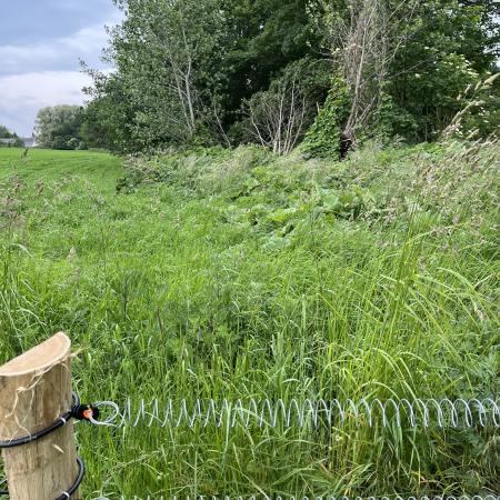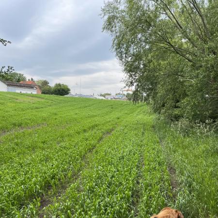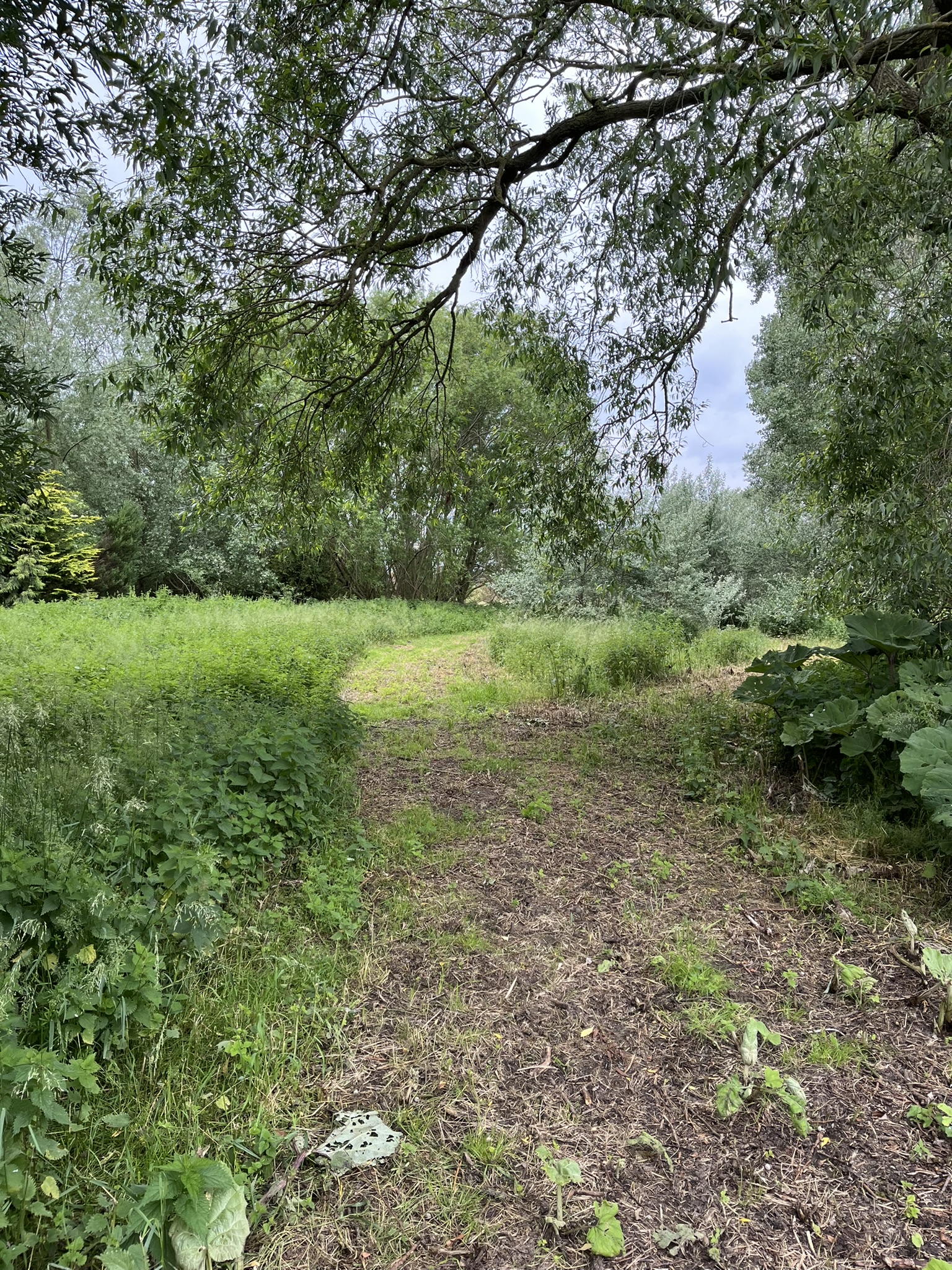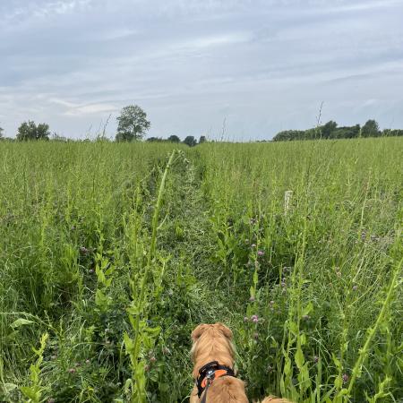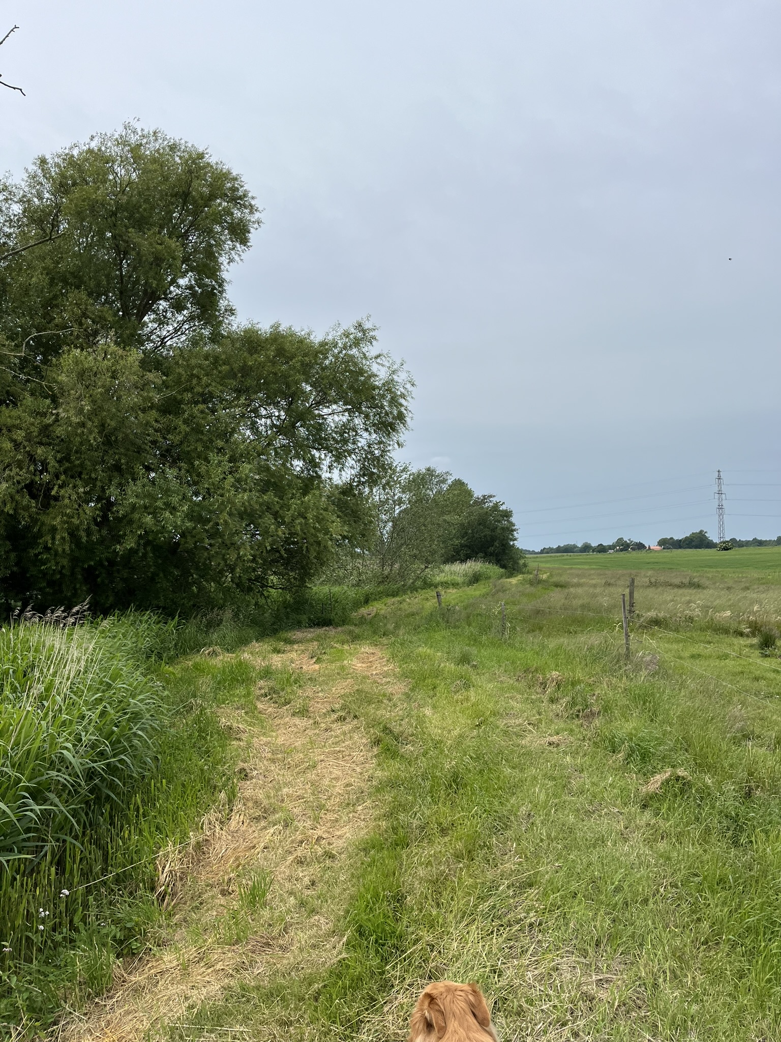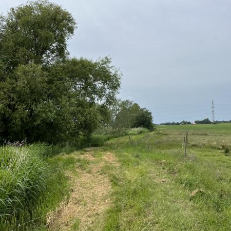 Et skilt havde annonceret endnu et område med vilde køer, og vi fandt dem helt bagest i området, hvor de nysgerrigt kiggede på os, som om de ikke havde set mennesker (eller hunde) i årevis. Et hegn ledte os væk fra å-kanten, men en låge lod os undslippe, men nu gik sti-kvaliteten markant ned. Det var en vildtgroende rapsmark, hvor en traktor nok havde kørt for et par måneder siden og man kunne snuble sig afsted i et af to hjulspor. Denne sti endte i midten af ingenting, men på den anden side af endnu et hegn, så det ud som om, at hjulsporene fortsatte, så vi forcerede hegnet og fortsatte, indtil vi kom tilbage til åen og endnu en låge, som ledte os ud på en græsmark.